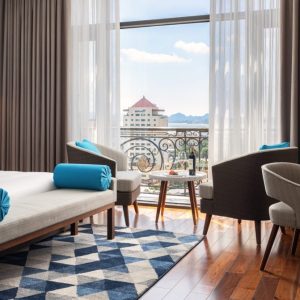 Phòng ngủ được cách âm và trang bị đầy đủ thiết bị như TV LCD, wifi tốc độ cao miễn phí và quầy mini bar với nước khoáng, trà, cà phê. Cửa sổ mở sẽ giúp mang tới tầm nhìn rộng ra khu vực Bãi Cháy tấp nập, tạo cảm giác vừa thoáng đãng, vừa dễ chịu. Phòng tắm được thiết kế với bồn tắm lớn, vòi sen và các tiện nghi cao cấp khác, cả tổng thể được điểm xuyến với tông màu vân gỗ sáng giúp đem lại cảm giác sang trọng.